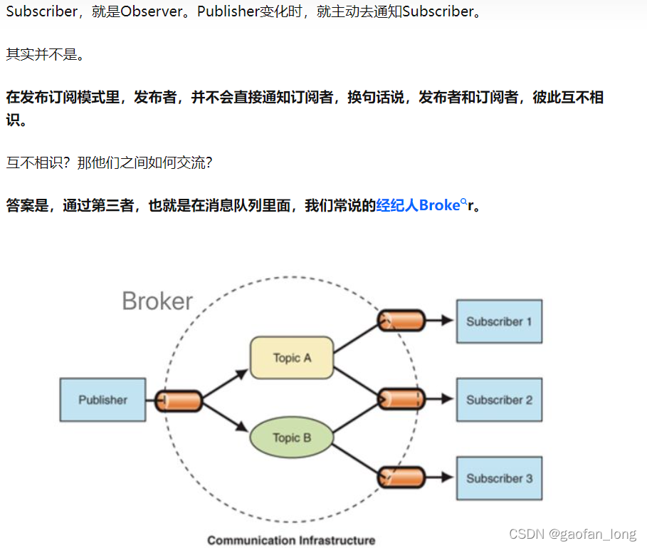 观察者模式是只有两个参与者,消息发布者和订阅者,是松耦合的编程方式。订阅者必须要知道发布消息的是谁。
