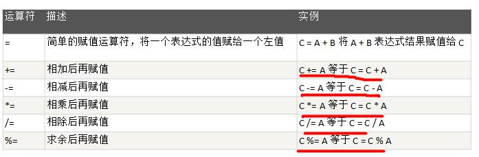 2)赋值运算符(=,+=,-=,*=,/=,%=)