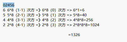 公式:从低位开始(右边开始),将每个位上的数提取出来,乘以8的(位数-1)次方,然后求和