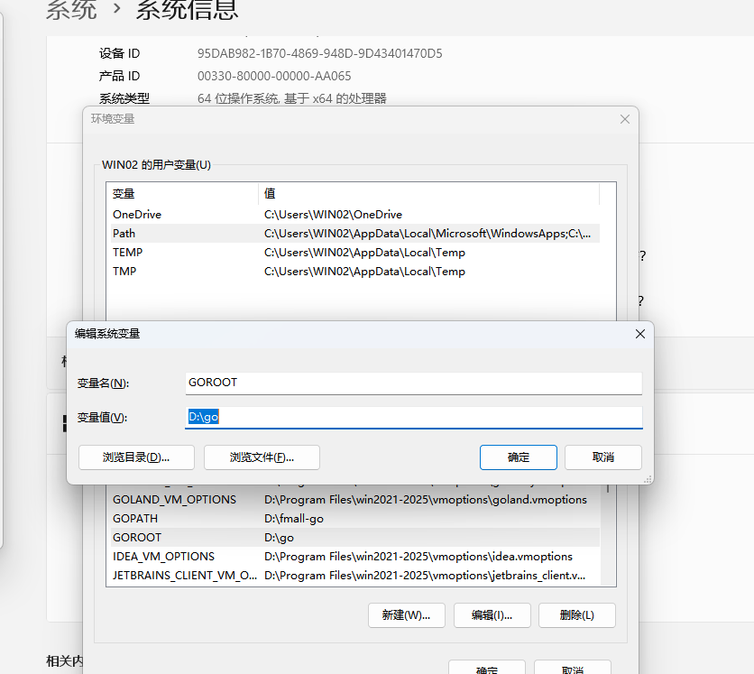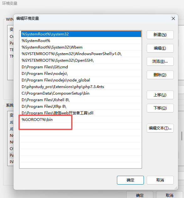 其中GOROOT,GOPATH在环境变量中没有,需要添加,Path在环境变量中已经存在,在尾部编辑添加