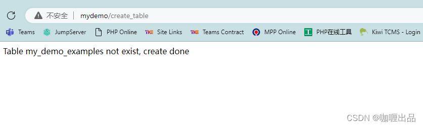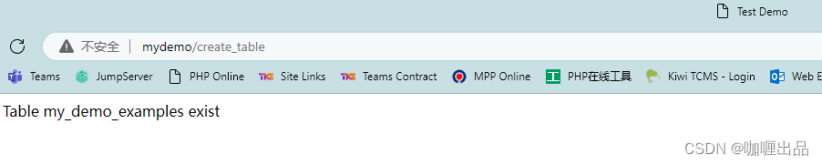 表已创建成功,这时在浏览器再运行 http://your-local-host/create_table,会提示表已存在,如下图: