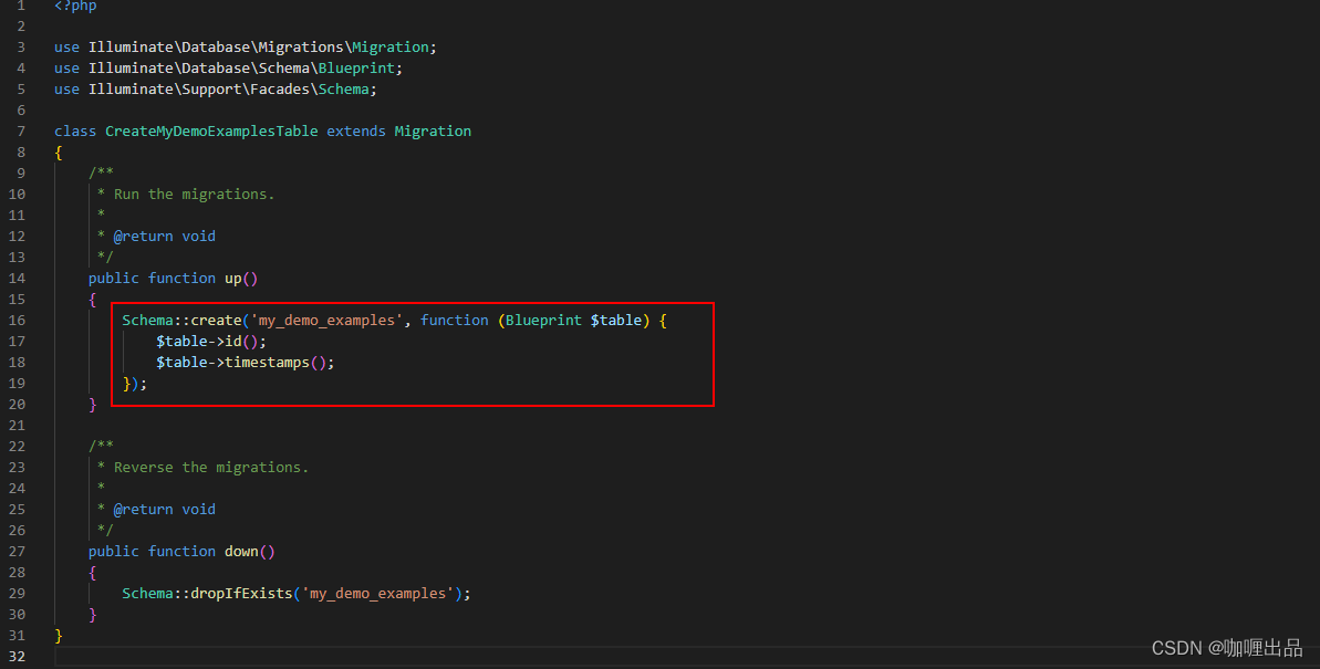 Schema::create('my_demo_examples', function (Blueprint $table) {