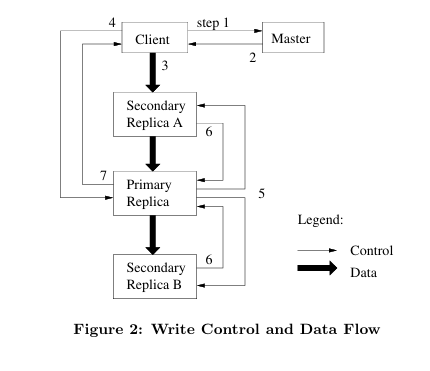 GFS客户端向集群中写入文件内容的大致过程如下:(可参考下面官方论文插图)