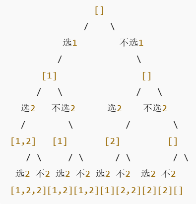 题设给我们的整数数组是可能包含重复元素的,但是解集不能包含重复子集,要求我们返回全部的子集。与前面“组合型”的回溯不同,子集并不严格限制元素个数,而且我们不考虑顺序。哪怕是空集也是其中一个子集。实际上我们在考虑问题的时候可以从子集的定义出发,实际上每个元素都有两种状态:被选进子集和不被选进子集。由此我们可以自然地想到:对于每一个元素,递归地考虑“选”和“不选”这两种情况,最后把路径保存下来,我们不难发现这是一个二叉树结构。对于用例[1,2,2]我们可以结合下面的回溯树来理解: