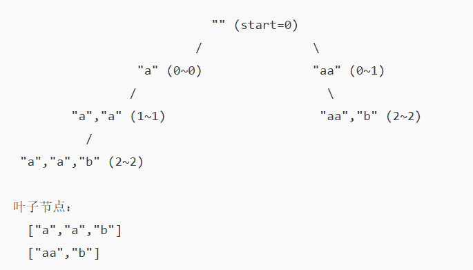 相信大家如果有一定的做题量,那一定对回文串这个概念不会陌生。回文串的判断逻辑通过一个while循环写对撞双指针就能实现,这里不再过多介绍,我们将这个模块拆成一个函数来写。接着我们来看题设,将字符串s划分为若干子串,使每一个子串都是回文串。实际上,这个子串可以从原串的任何位置开始,所以我们需要维护一个start,从start开始进行分割。递归逻辑其实是从start开始,尝试所有end。如果s[start~end+1]是回文串,则将这个回文串收集并递归调用,继续处理剩下的子串。如果 start 到达字符串末尾(start == len(s)),说明我们找到了一种完整的分割方案,将其加入答案。有点类似于“区间尝试模型”。当讨论完一种完整的可能性之后,进行回溯,移除之前加入的子串。可以通过下面的回溯树进行理解(假设s="aab"):