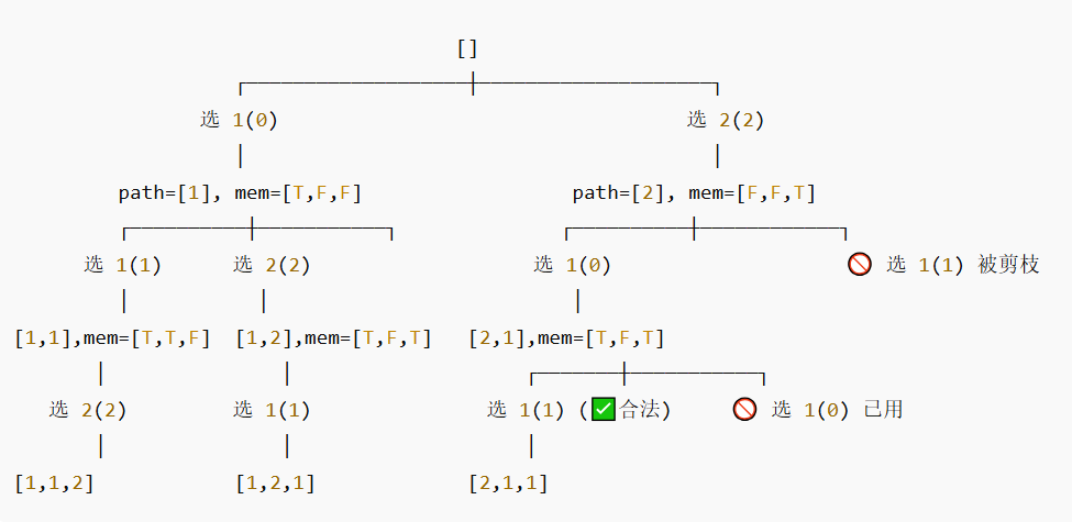 区别于前面子集问题选或不选的二叉树结构,全排列问题递归的核心是在还没用过的元素中挑一个!也就是说,全排列的递归 不是二叉树,而是“多叉树”,每一层的分叉数取决于“还剩多少个元素”。每一层都能尝试所有元素,但不能重复用,所以要挂个 mem[i] 布尔缓存进行标记,这便实现了同层去重。由于题设中给出的集合可能包含重复元素,所以我们最终得到的全排列也可能会包含重复元素。同层去重只在前一个相同数字没被用过时才跳过;如果前一个已经用过,说明是同枝,可以继续用。同层重复被跳过,而同枝(路径延伸)可以继续使用。和之前子集问题一样,可能会出现相同的全排列,我们采用的去重方式(排序去重)和子集II问题中的策略完全相同,此处不再赘述,大家可以结合下面的回溯树来理解: