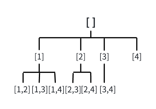 按照前面给出的公式,会形成C(4,2)=6个不同的组合。假设我们固定i=1,枚举其他数字就会形成[1,2],[1,3],[1,4]这三个组合。此时发现i=1的情况已经枚举完了,发现“撞了南墙”,那我们回头开始枚举i=2的过程(这一步就是回溯),后面的过程同理。我们发现在没有“撞南墙”之前,实际上执行的操作都是相同的枚举行为,于是我们想到了DFS。这其实就是一个树形结构的DFS+回溯,下面我会给出一张图示,相信朋友们看过之后会有更深刻的理解。我在第一次思考的时候完全没想到树形结构,理由是我把[1,x]视为根节点,而实际上,这种问题根节点的状态往往是[]。