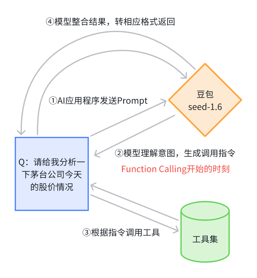 在Eino框架中,AI Agent的智能不仅体现在对自然语言的理解上,更在于它能主动调用外部工具完成任务。这种能力的实现依赖于一个核心机制--Function Calling(函数调用)。简单来说,Function Calling 就是让模型在对话过程中学会“调用函数”,从而让模型具备“动手能力”。这里我详细介绍下,Function Calling这个概念有广义和狭义两个层面。广义的Function Calling是指让大模型能够调用外部工具的一种技术实现,首先向大模型提供工具集以及说明,由大模型在对话过程中智能判断是否需要调用工具。我们今天探讨的Function Calling属于广义层面的范畴。而狭义的Function Calling特指大模型提供商在模型内部与API层面做了支持的一种能力,最早由OpenAI引入,在模型层面:模型提供商需使用海量的函数调用数据对大模型进行专门的微调或强化学习训练,使其具备更强的意图识别,函数选择,参数生成能力。假如我向大模型提问:请给我分析一下茅台公司今天的股价情况,工作流程大致如下图: