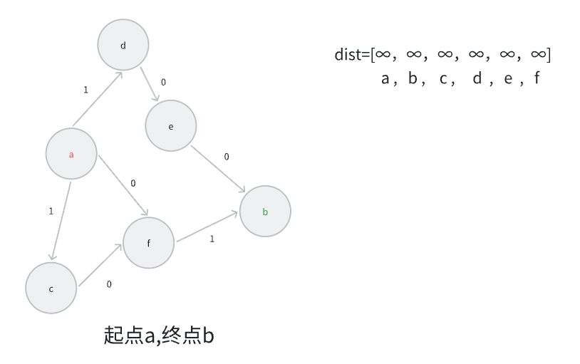 首先我们将源点a加入双端队列,并设置dist[a]=0。之后从队头弹出源点a,从源点a出发可以前往节点c,d,f,因为初始化的dist都是∞,拿节点c来说,dist[c]>dist[a]+1,所以更新dist[c]=1,同理dist[d]=1,dist[f]=0;与此同时,f从头部进入双端队列,c,d从尾部进入双端队列。之后我们从头部开始弹出节点f,从节点f出发可以前往节点b,由于dist[b]>dist[f]+1,所以更新dist[b]=1,同时b从尾部进入双端队列。接下来的过程与之同理,直到节点b第一次被弹出时,我们边求得了这个“最短路”,路径长就是dist[b]。不难发现,其实双端队列的精髓在于其内部设定了一个潜在的“优先级”,即优先处理边权为0的边,但是边权为1的边也不是直接不管,但是“得往后稍一稍”。那其实上面这道题目就完完全全是一道0-1BFS的模板题,基本上没什么出入,示例代码如下: