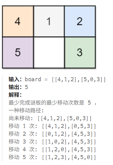 这道题颇有一点“智力题”的成分了。上图我贴出了leetcode官方给出的最复杂的一个示例,相信朋友们能够由此搞明白完成谜板的过程。当board为[[1,2,3],[4,5,0]]时谜板被解开。老实说刚开始思考这套题时还是感觉比较棘手的,因为每个小块的移动并非是独立的,它们之间存在强耦合关系,一个小块到目标位置的最短路径并不能保证全局最优,所以以每个小块为源点去跑BFS貌似是行不通的。