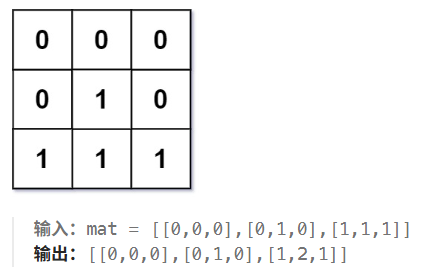 这道题可以说是一道相当经典的多源BFS例题了。上面是leetcode给出的示例,输出矩阵的每个位置代表从该位置到最近的 0 的距离。我其实一上来就会想从每个1出发,找与其最近的0,但是那样其实需要对每个1都进行一次BFS,存在超时风险!正难则反,我们不妨从每个0出发,然后一圈一圈向外扩展,当每个1第一次被访问的时候,就可以计算出到最近的0的距离。很精妙,这个距离正是由层数来维护的!这也就是BFS的强大之处之一--利用层数维护距离。每一次出队入队,代表距离+1。在网格图中,我们常常维护的是节点的横纵坐标,在C++中可以用pair对组维护。在扩展过程中,为了防止已访问的空间导致不必要的时间开销,我们可以维护一个标记矩阵dist,同时可以借此记录答案。示例代码如下:
