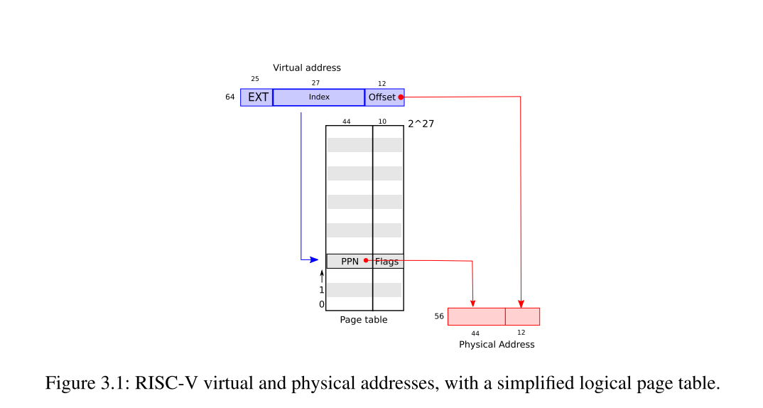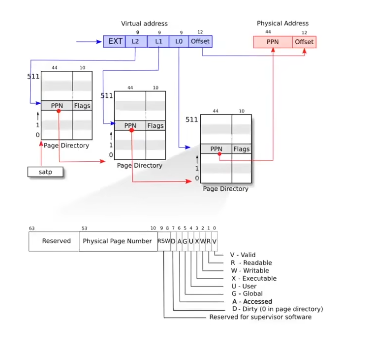 整体流程如下,拿到虚拟地址之后,首先查看satp寄存器,找到第一级页表的物理地址,同时取出前9位,L2的索引(EXT忽略),确定特定的PPN后,根据此PPN的信息,找到第二级页表的物理地址同时取出L1索引,查找到特定的PPN之后,根据此PPN信息,找到第三级页表同时取出L0索引,最后在第三级页表中超出特定的PPN,加上虚拟地址的业内偏移唯一确定实际的物理地址。