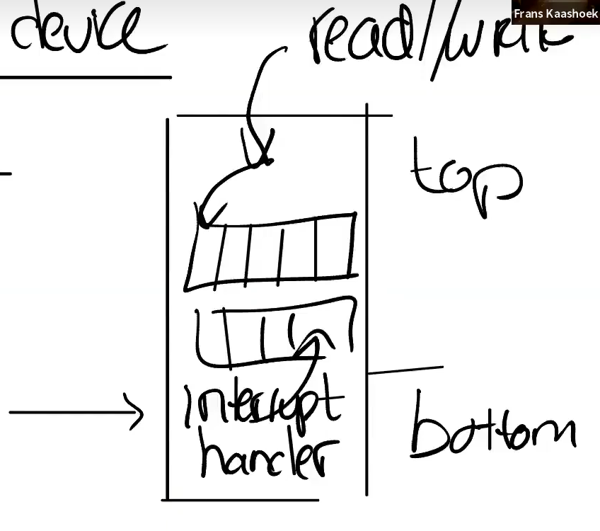 驱动程序的代码结构如下所示,将地址空间分成上下两部分,上方top主要应对和其他模块交互的接口(read/write),下方存放中断处理程序,中部存放缓冲队列,一般有两个缓冲队列,分别对一个读和写两个操作。即需要读时,设备产生中断,中断处理程序将接收到的数据从输入队列中取出,供上层应用read;当需要写时,用户调用write将数据写入输出队列,驱动程序将队列中的数据写入硬件寄存器或者设置DMA传输。