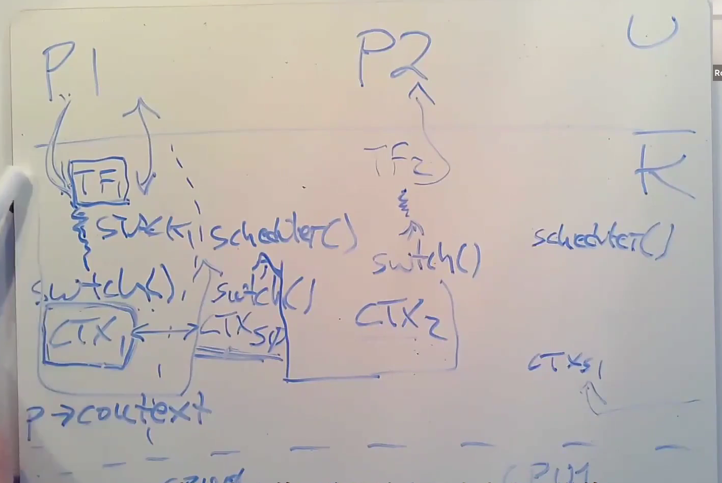 大致的流程可以理解为:P1用户进程首先由于时间中断,保存用户寄存器到trapframe中,之后进入内核态,内核级线程拿到cpu控制权,随后在中断处理程序中会有switch函数,该函数会保存当前P1的内核级线程的context(上下文),随后将cpu的控制权出让给该cpu的调度器线程(每个cpu都有独属于它的调度器线程)该调度器线程从所有内核级线程中按照某种策略选出合适的内核级线程P2唤醒,具体就是将当前的cpu信息修改成该内核级线程P2保存的context,注意该context也是该内核级线程P2之前在switch函数中保存的信息,故恢复信息后,就又跳转到该内核级线程P2的switch函数,随后恢复P2的trapframe信息,返回P2的用户级线程。