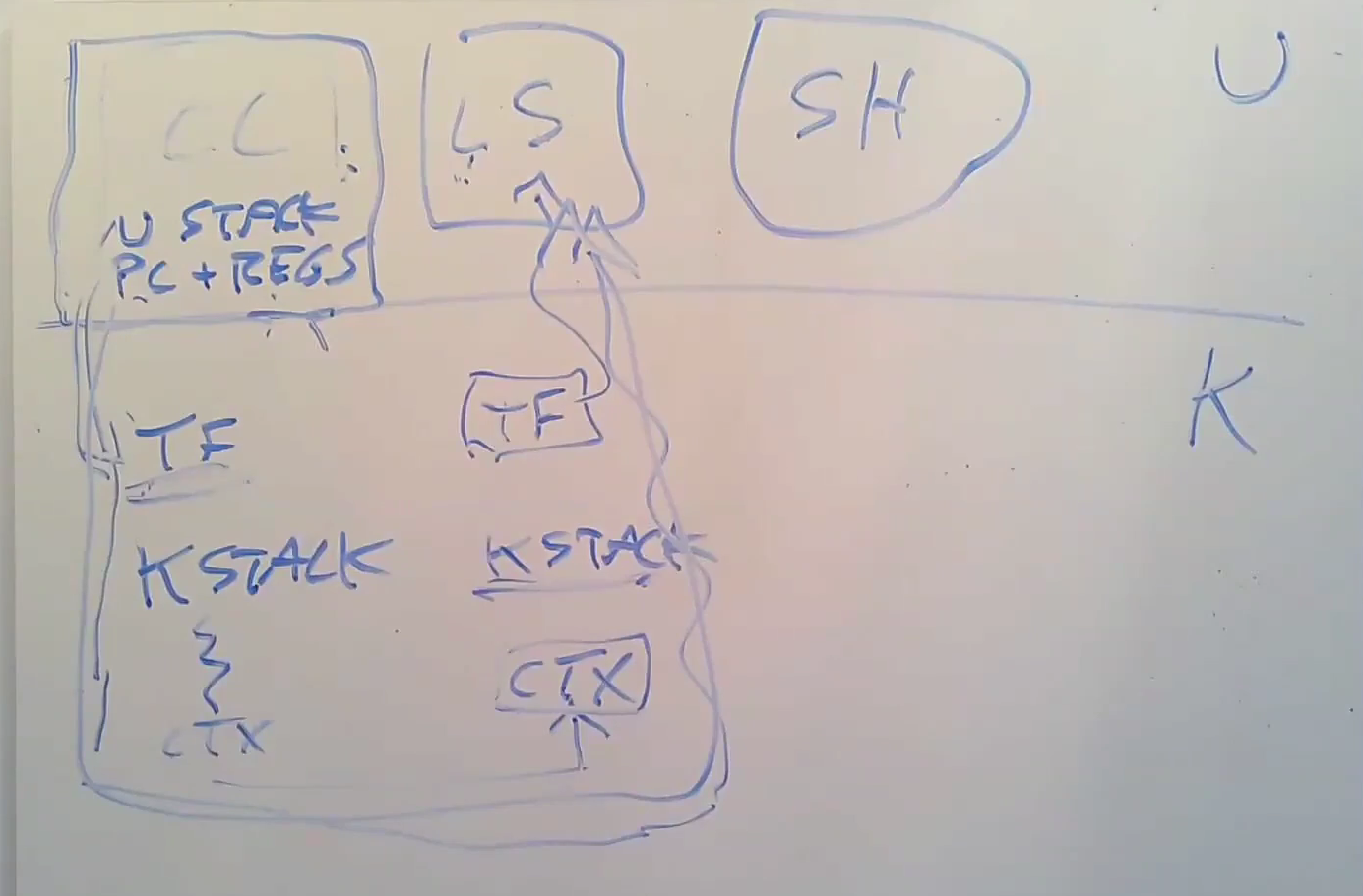 大致可以理解为CC用户线程在用户空间运行,随后定时器中断,该线程将用户运行的状态保存在trapframe中,随后内核级线程保存其上下文,线程调度器从cc的内核级线程切换到cs的内核级线程,将cs内核级线程的上下文的信息加载到cpu上,随后恢复cs的trapframe,返回cs的用户空间,运行cs的用户级线程。所以xv6从不直接进行进程的切换,而是将调度权放在内核中,通过内核级线程的切换实现进程的切换。
