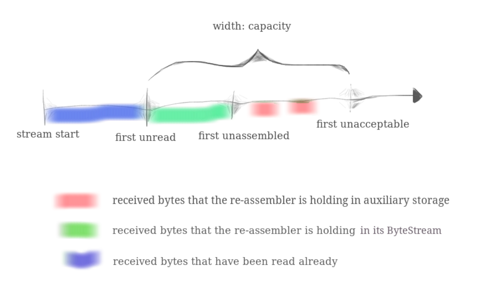 如lab1文档所说一样,实际上我们维护的是两个容器,一个容器维护我们接收到的乱序字节流,一个容器维护我们已经排好序可以直接使用的有序字节流(实际上就是我们lab0实现的ByteStream)。这里容量指的是这两个容器容量的总和,即这两个容器存储字节总和不能超过capacity,同时这两个容器也都是动态更新的。具体如下图所示: