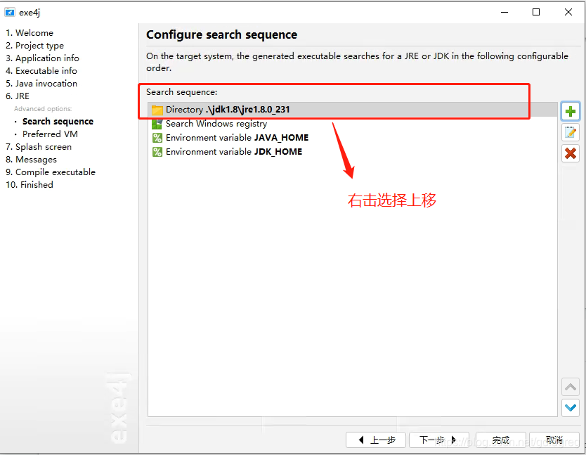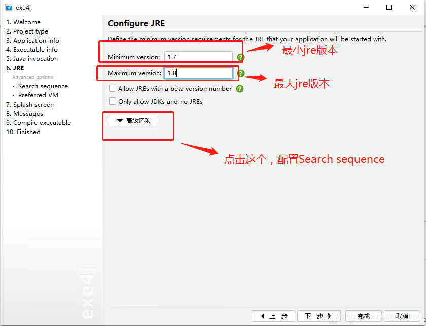 8、点击下一步,填写程序jre版本范围,点击高级选项配置Search sequence选项