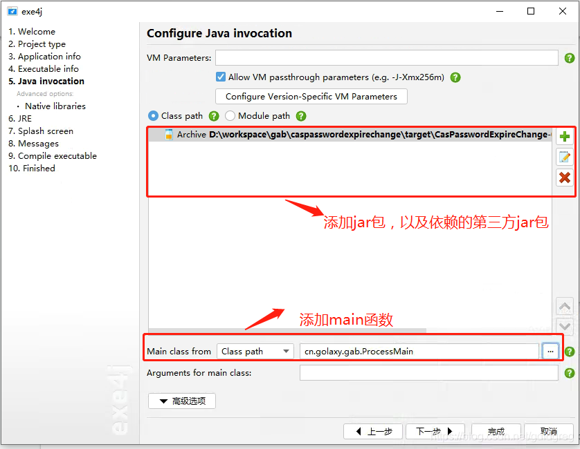 7、点击下一步,添加jar程序包,以及依赖的第三方依赖包,并添加main函数