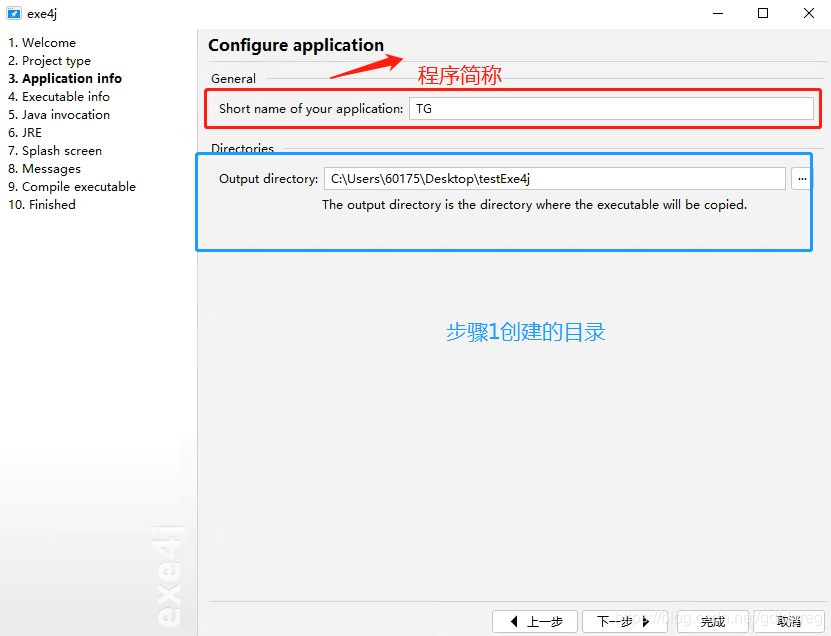5、点击下一步输入程序的简称,以及exe导出目录,即步骤1中创建的目录