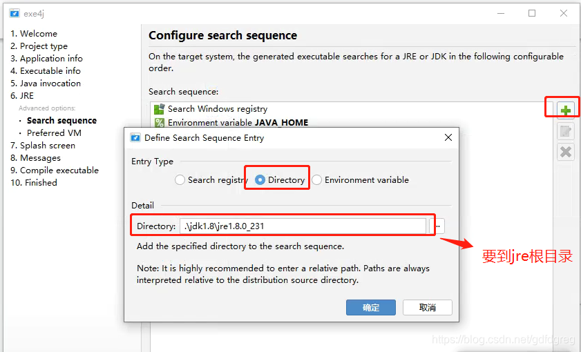 9、点击+号,添加jre根目录,该目录在步骤1中创建的文件夹里,并将该路径移到最上方