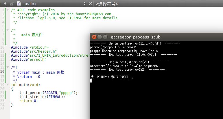 上边两个函数用于处理错误信息。常用的是perror(),下面是函数使用代码和结果截图: