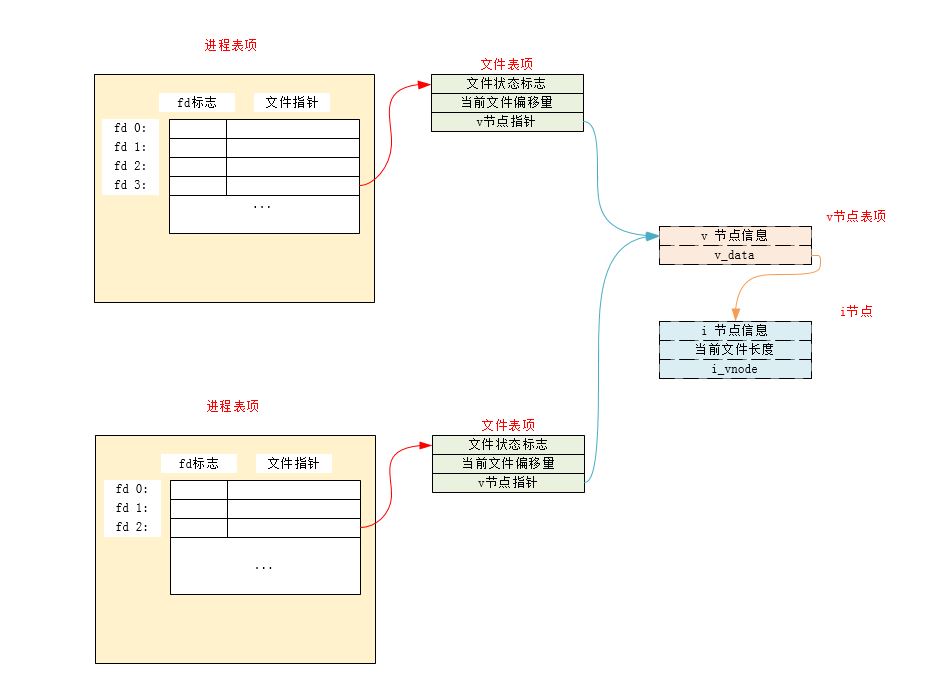 内核使用三种数据结构描述打开文件。它们之间的关系决定了一个进程与另一个进程在打开的文件之间的相互影响。现在假设进程 A 打开文件 file1,返回文件描述符 3;进程 B 也打开文件 file2,返回文件描述符 2: