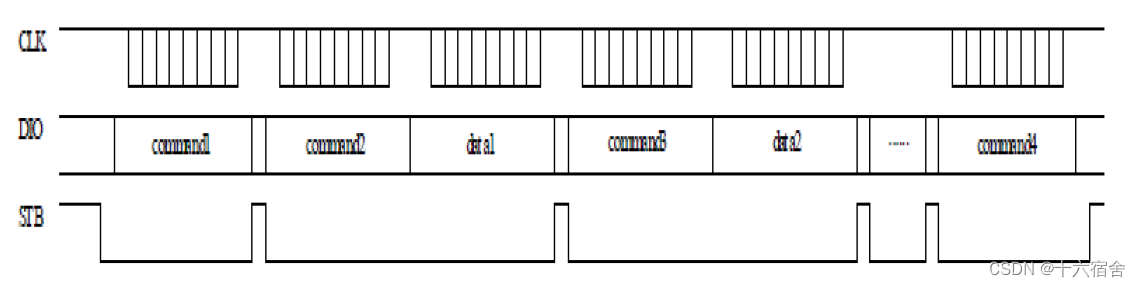 Aip1629A芯片通信使用的是类I2C物理链路层总线协议,下面是它的指令数据传输过程,可以看出可以抽象成通过传送8位以及16位数(指令或者数据)两个接口实现: