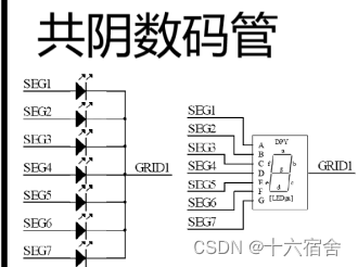 - 共阴/共阳:共阳极是将所有段对应的发光二极管阳极接倒一起,共阴极是将所有段对应的发光二极管阴极接到一起,下图是一个7段共阴数码管: