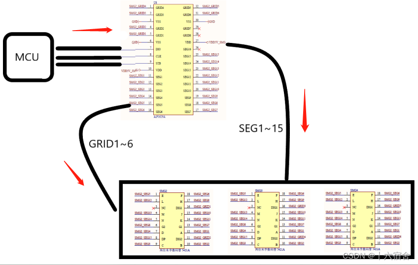 - 数码管位/段:数码管的段(SEGMENT)指的是构成一个数码管的每个发光二极管,而位(GRID)指的是这个这个数码管的“片选”引脚。