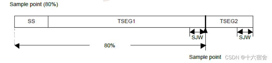 - CAN采样点:CAN发送的每一位数据(0或者1)维持的时间由由几段时间构成:同步段(SS),物理延时段(TSEG1),误差补偿段(TSEG2),实时同步补偿段(SJW)。采样点是接收机采样确定电平高低的位置,在TSEG1段之后,大部分情况为百分之80%,车厂会提相应要求。采样点位置如下图: