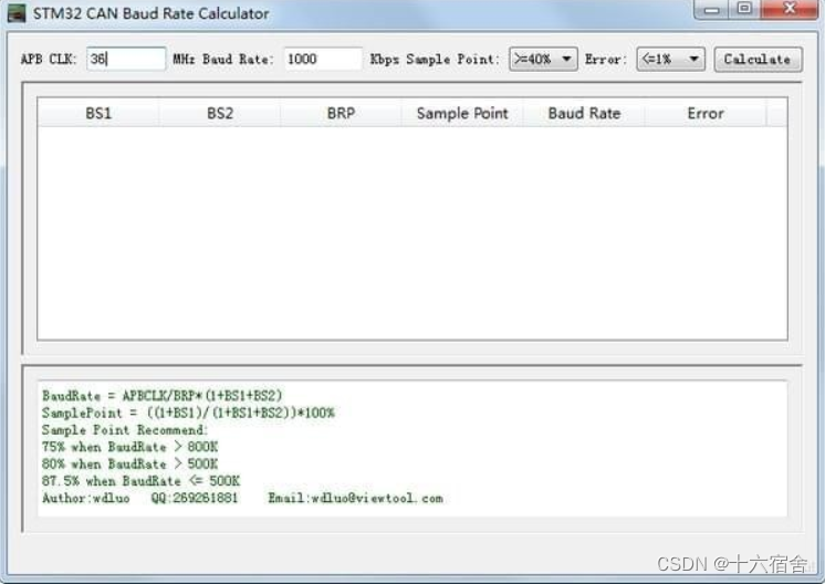 - CAN速率与采样点配置:如上代码所示CAN速率是由几个时间段参数计算而成,ST提供了工具帮助我们生成针对不同速率与采样点位置的参数,软件截图如下: