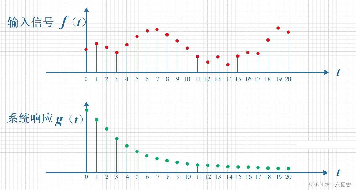 如下图所示,输入信号是 f(t) ,是随时间变化的。系统响应函数是 g(t) ,图中的响应函数是随时间指数下降的,它的物理意义是说:如果在 t=0 的时刻有一个输入,那么随着时间的流逝,这个输入将不断衰减。换言之,到了 t=T时刻,原来在 t=0 时刻的输入f(0)的值将衰减为f(0)g(T)。