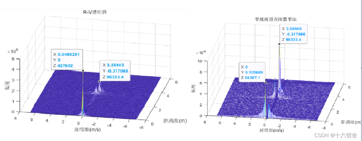 零速通道置零法方法在2D-FFT(速度维FFT)后直接将零速附近通道置零,此操作意味着静止目标或者低速目标会直接消失,此操作意味着静止目标或者低速目标会直接消失,下图左中信号的直流分量幅值很高,目标的幅度被直流分量严重压制,在进行后续的CFAR处理之前最好能够将信号的直流分量去除,便于提高雷达的性能,右边是采用零通道置零法之后的R-V谱矩阵,可以看出,这种方法对直流分量有一定的抑制效果,但对目标的微多普勒信息有一定的损失。因此,采用这种最简单的方法需要考虑具体的应用场景。