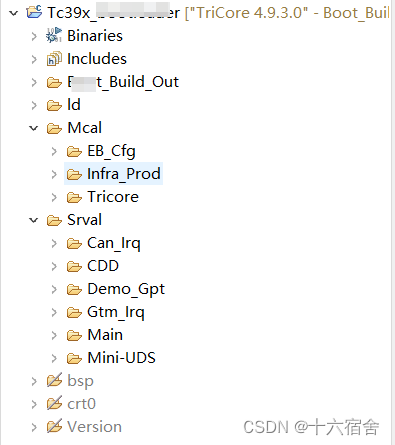 - Tricore:文件夹下包含MCAL静态代码,文件来自MC-ISAR_AS422_TC3xx_BASIC_1.40.0\McIsar\Src\Mcal\Tricore目录下需要包含模块的驱动静态代码。