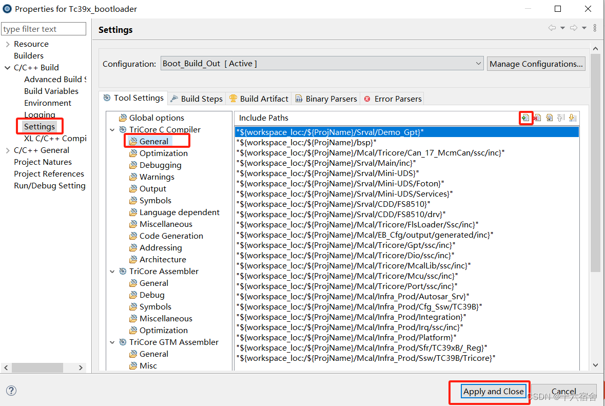 根据需要包含工程编译时的包含路径(.h文件路径),在Settings下面的TriCore C Compiler的General进行添加。