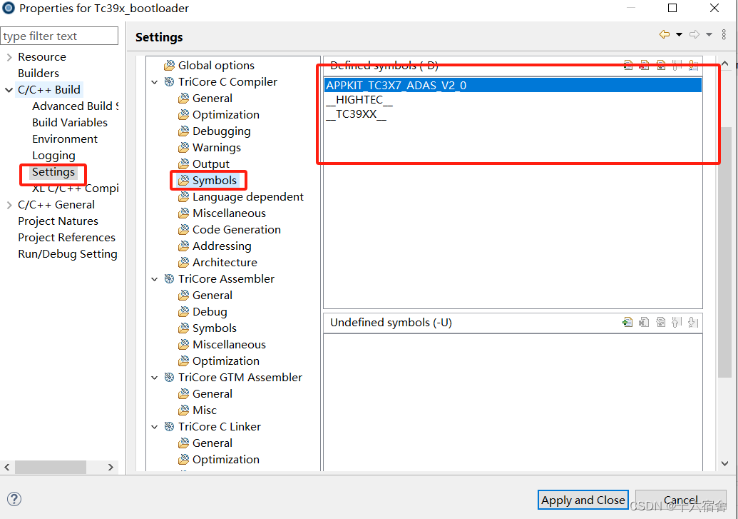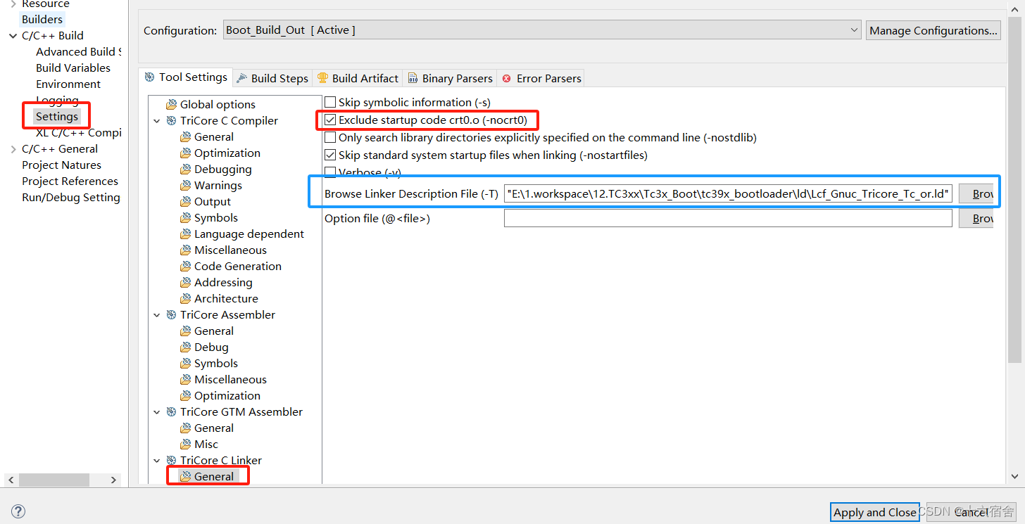 修改启动文件来自MCAL,点击工程,右键选择Properties,打开工程属性,然后选择C/C++ Build下的Settings,然后再选择TriCore C Linker,勾选Exclude startup code ctr0.o。在下面将提前准备好的Linker脚本添加。