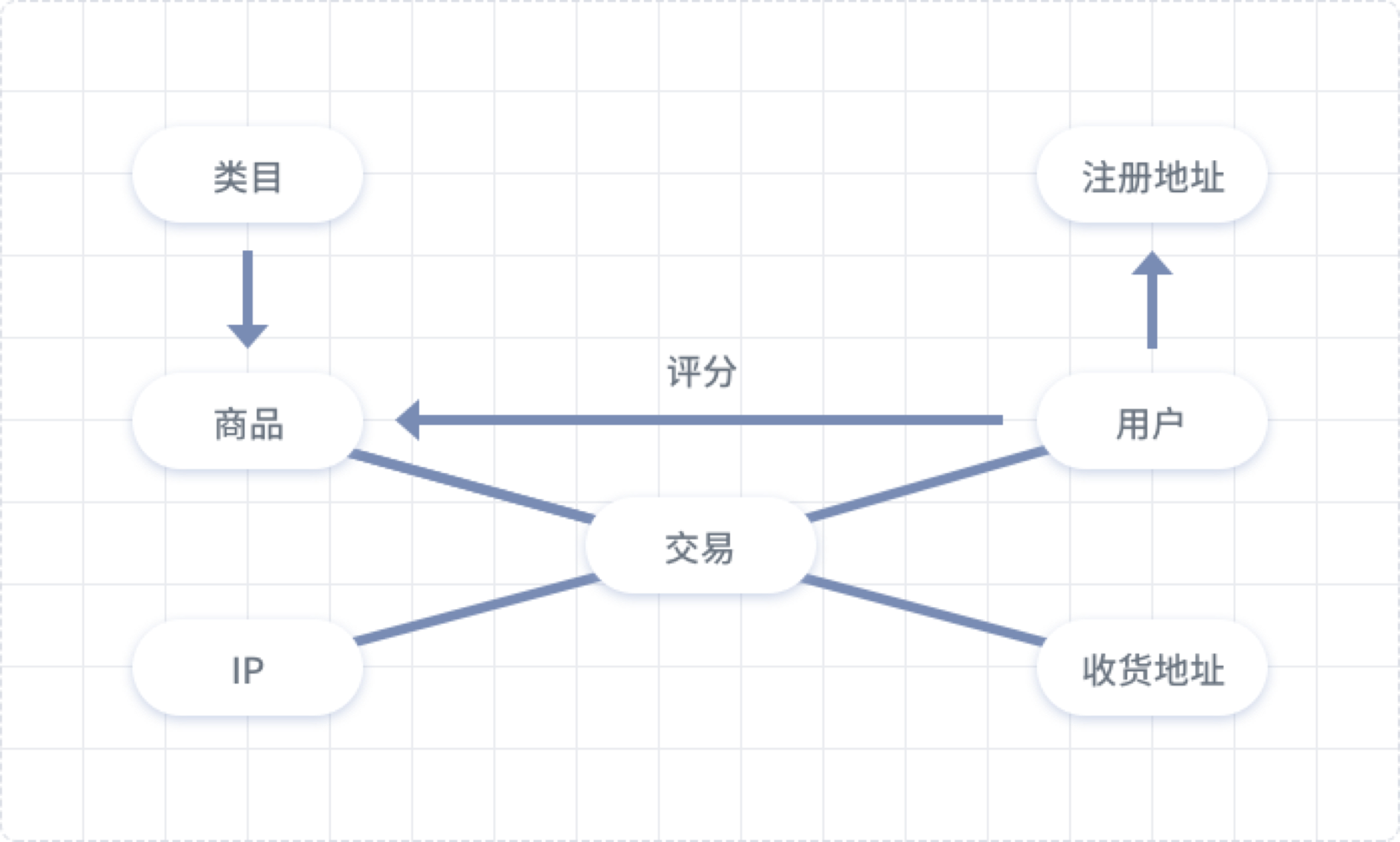 在电商中,我们首先可以想到的关键节点就是,用户、交易和商品。用户关联的节点比如会有注册地址、收获地址等;交易会关联到商品、收货地址、交易IP等、商品会关联类目等。这些节点之间的关系,比如用户除了可以通过交易购买商品,还可以对商品进行评分。这样的图数据我们可以用来做两件事情,一是推荐、二是反欺诈。