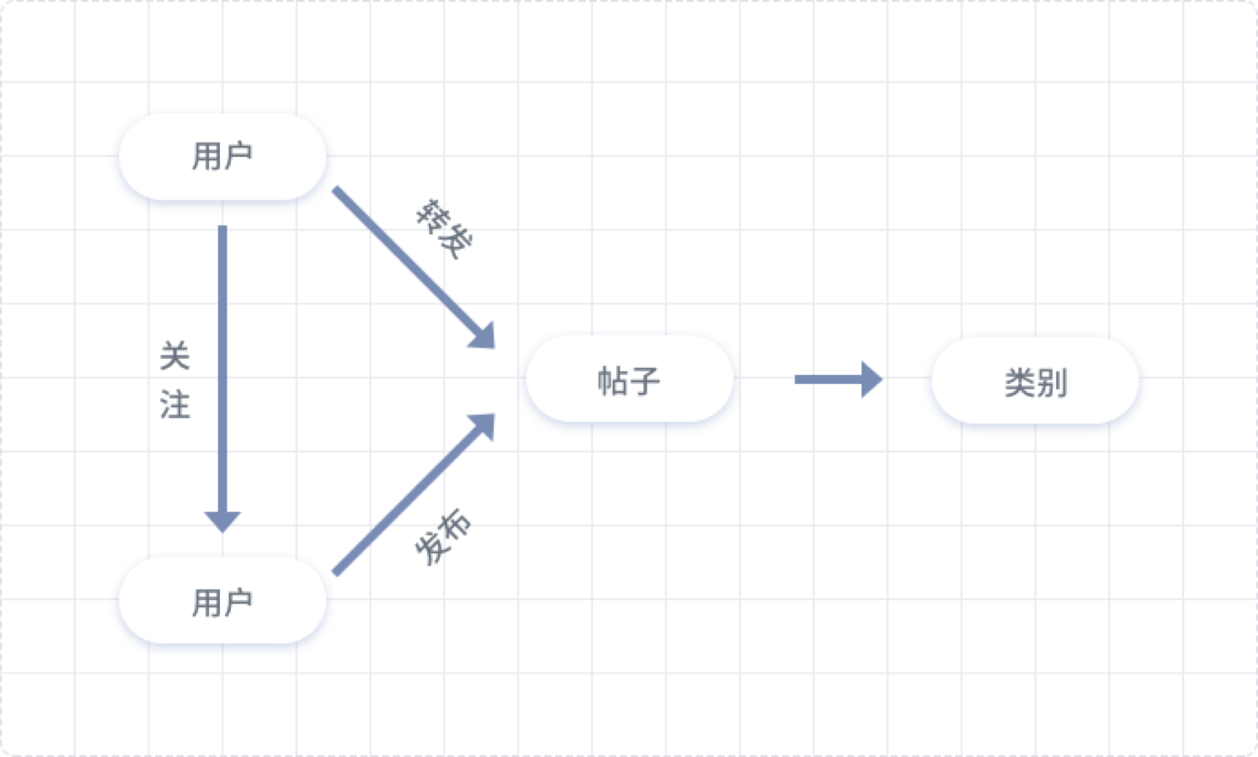 上面的图谱刻画社交网络中各个节点以及它们之间的关系,用户A、用户B、帖子都是节点,用户与用户之间的关系是关注,用户与帖子之间的关系可能是发布或者转发。通过这样一个图谱,可以分析用户对什么人、什么事感兴趣,进一步实现推荐机制。