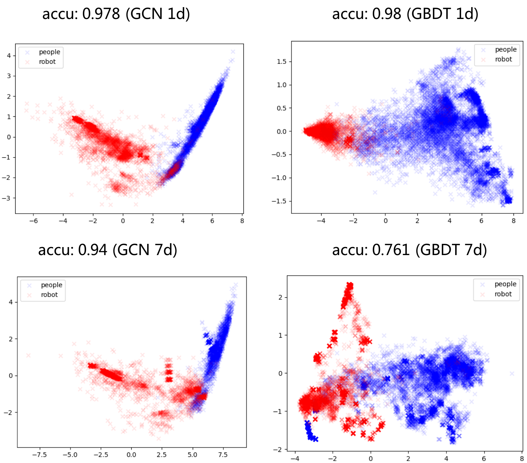 7d评估效果可视化,(用第一天的数据训练模型,第七天观察其预测效果及最后一层输出的tsne可视化结果)。上图可以看出,GCN在第七天时对样本判别的分界面仍很明显,但是GBDT对样本判别的分界面已经很模糊类了。综上,GCN学到的结构信息在人机判别中不仅效果很好,也具有更好的鲁棒性。