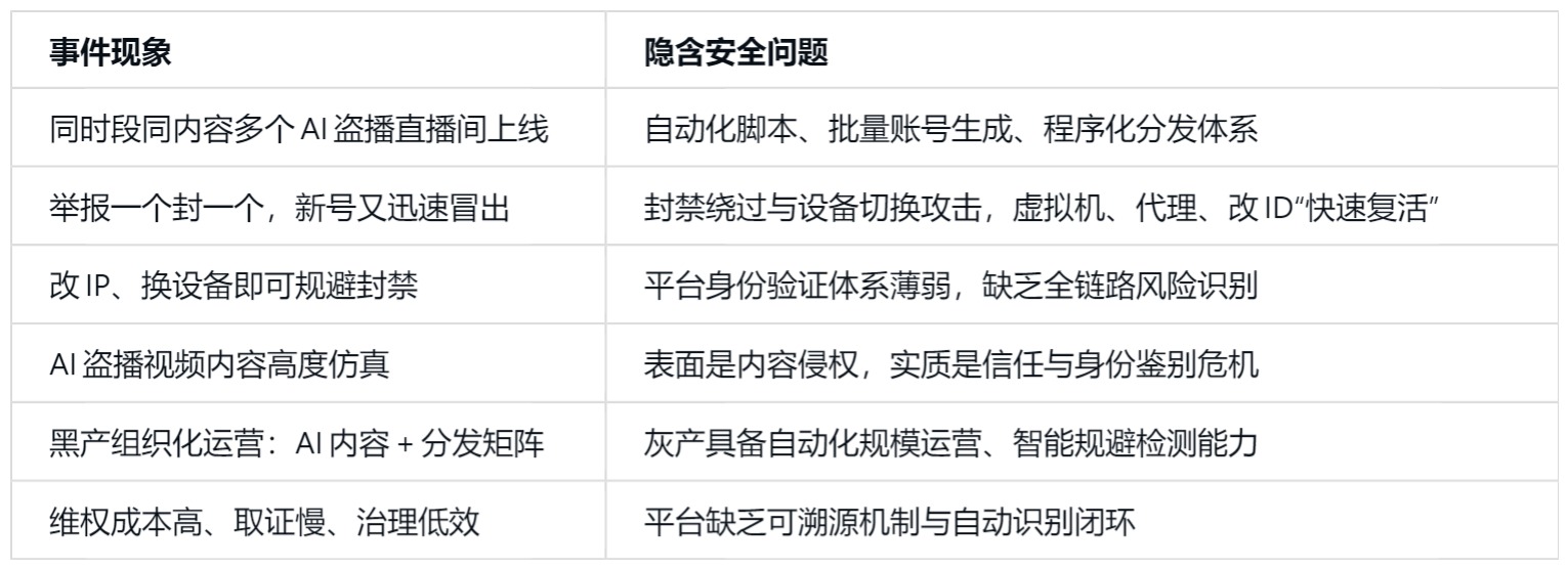 通过上述对应表可以看出,“AI盗播”从账号注册、登录、推流到内容分发,黑产已实现全流程渗透。平台所面临的已不仅是“侵权内容”上的甄别,而是要去应对一整套系统化的黑产工程。