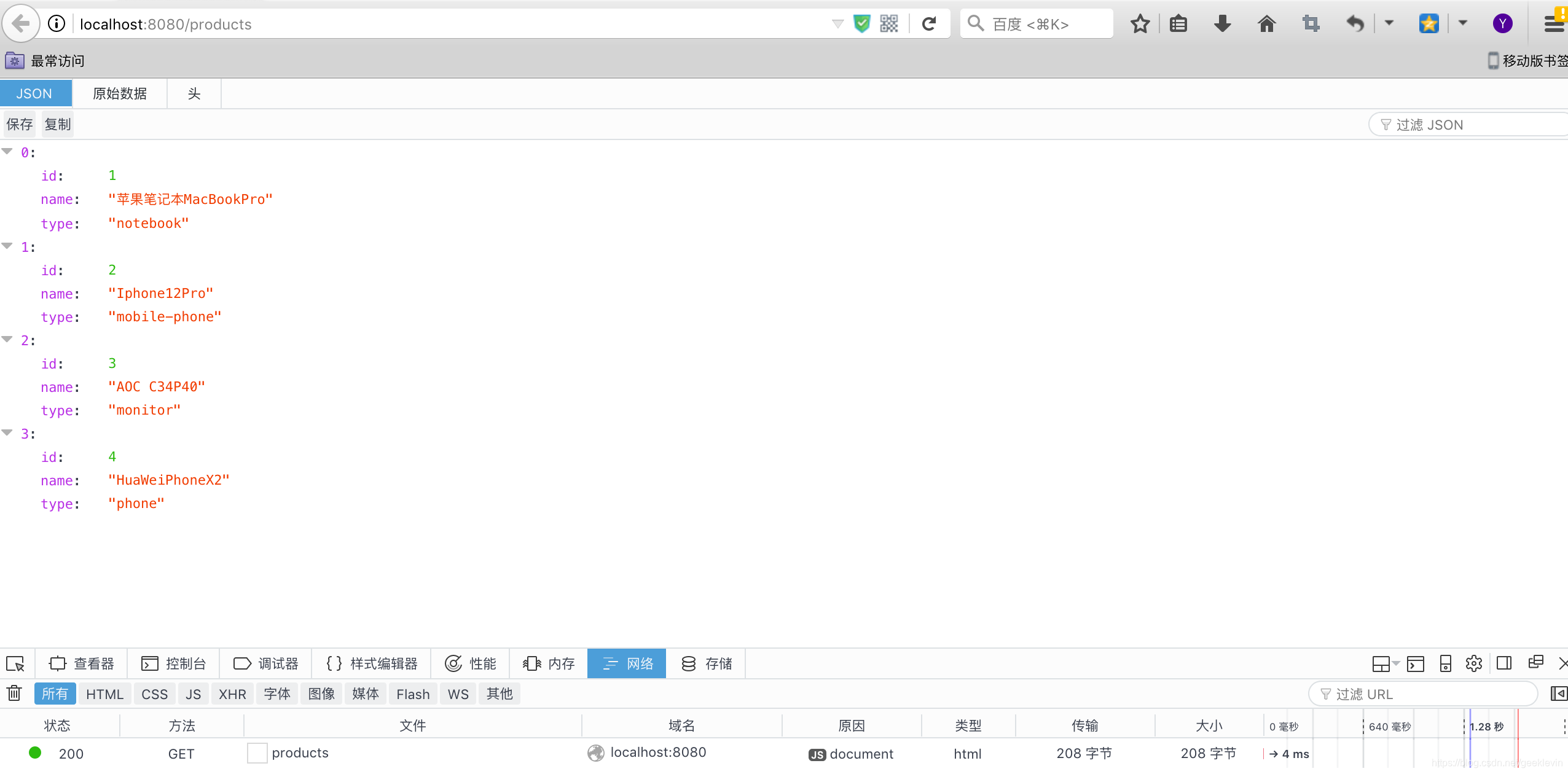 - 读取所有商品,打开浏览器访问:http://localhost:8080/products