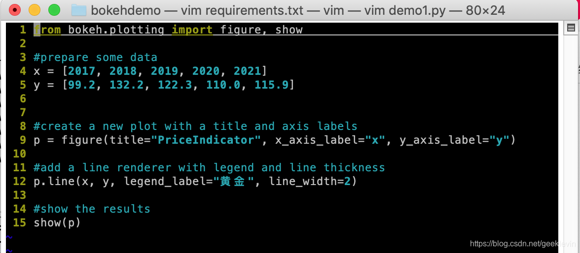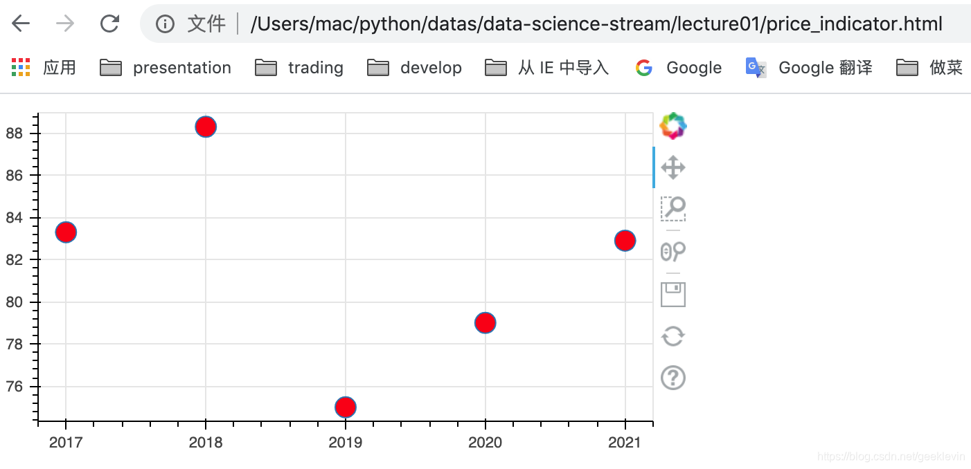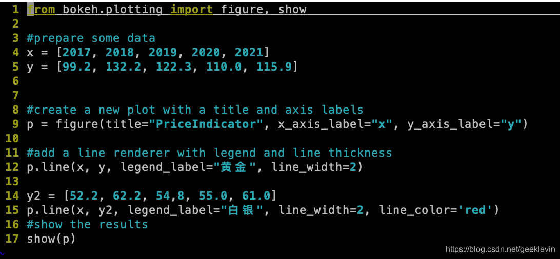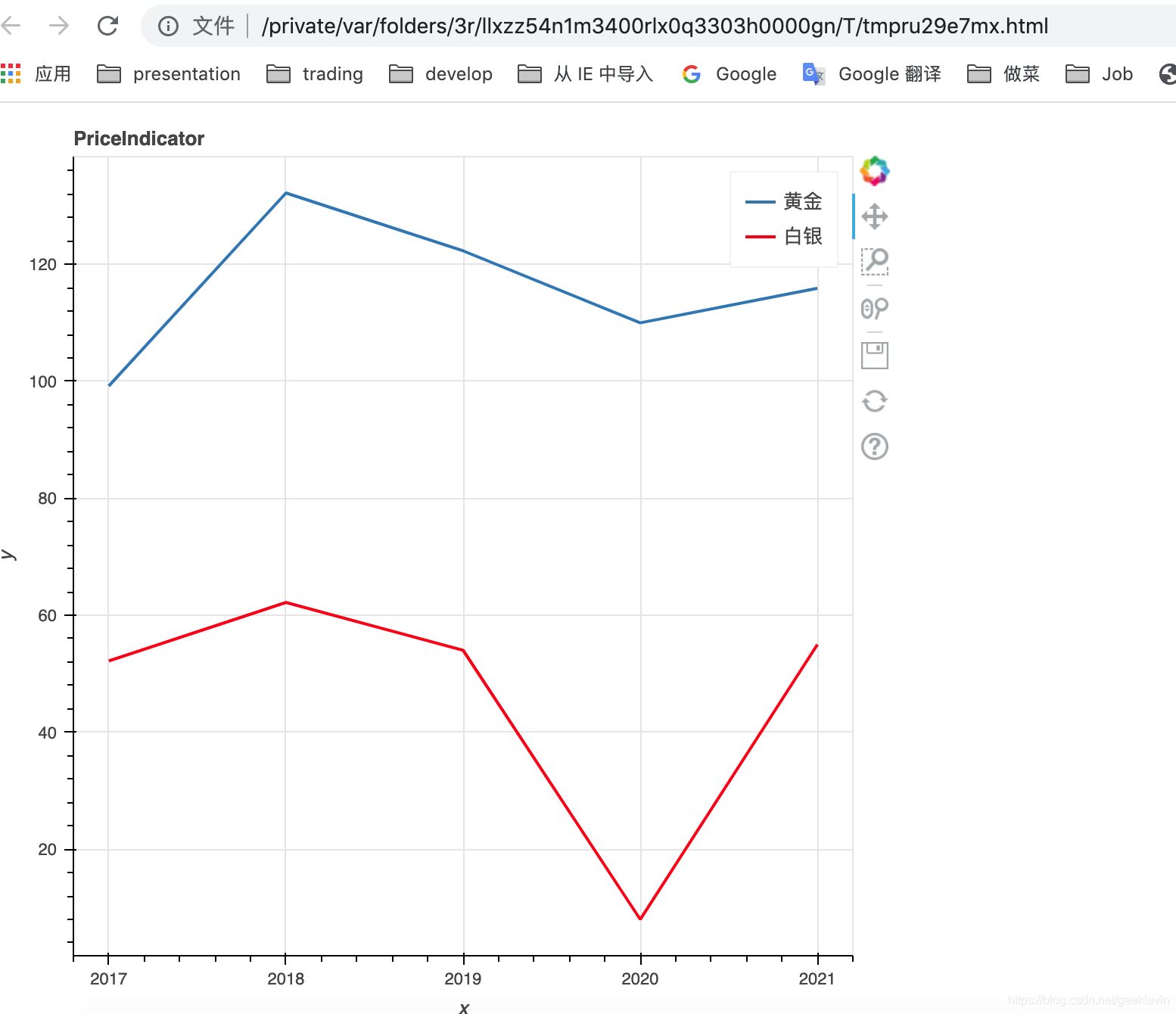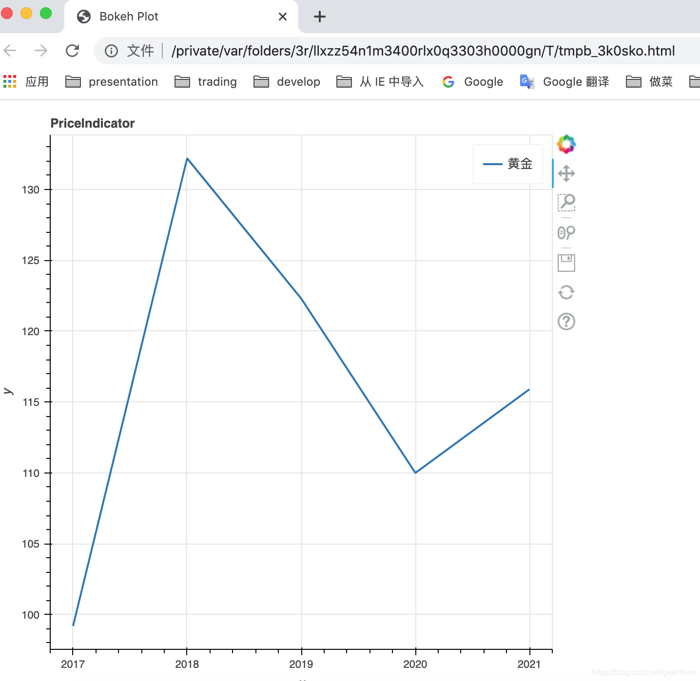 代码很直观:x数组为年份,y数组为一组虚构黄金价格。然后创建一个figure实例,p表示一张二维图。