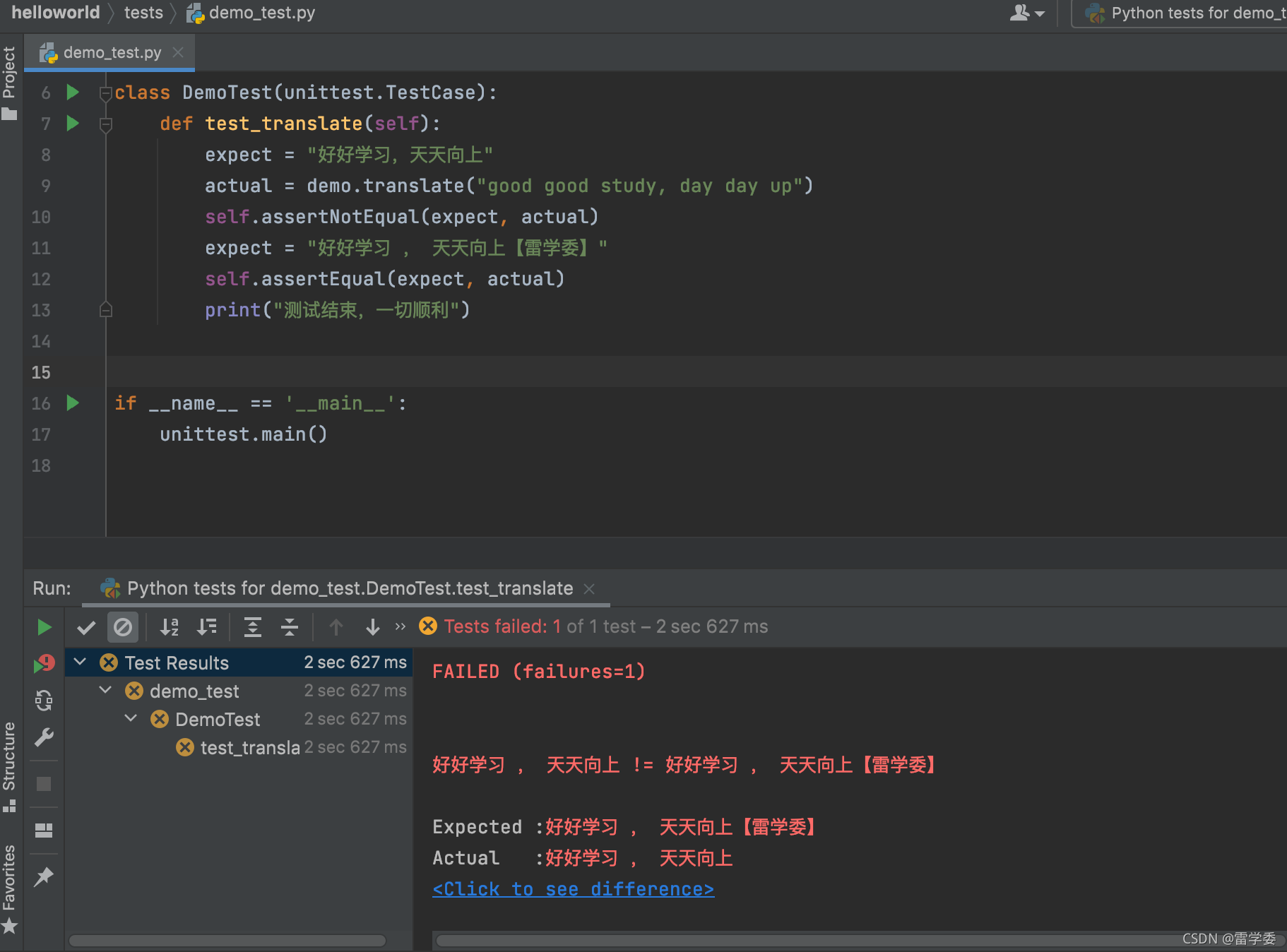 这里代码不贴了,读者直接定位测试11行,在expect文本内容添加‘【雷学委】’。