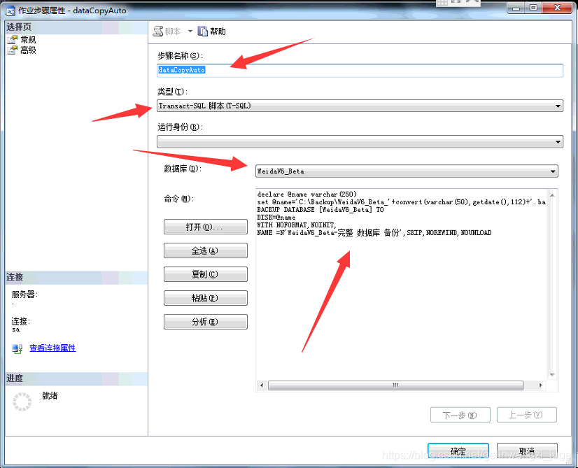 第四步:来到新建步骤界面:步骤名称自己定义,类型为: T-SQL(脚步运行),数据库自己选择需要备份的数据是哪个,下面的命令行里面输入:
