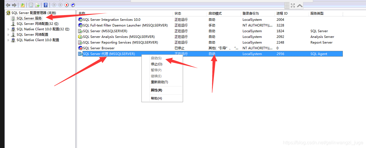 第二步:找到sql server服务-->右边找到sql server代理,然后右键启动,启动模式改成自动,记得TCP需要开启