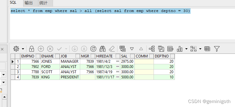 【例3.3.1】在emp表中,查询工资大于部门编号是30的所有员工信息