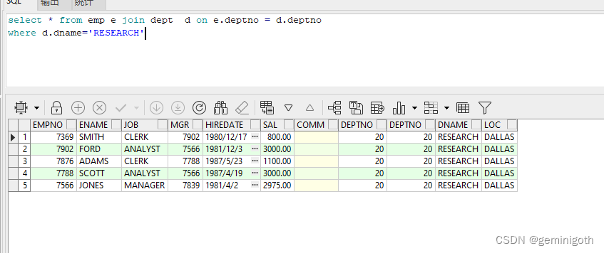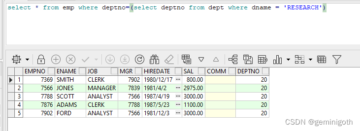 【例1.1】在Scott模式下,在emp表中查询部门名称(dname)为“RESEARCH”的员工信息。