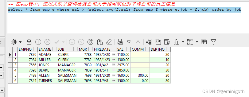 【例4.1】在emp表中,使用关联子查询检索公司大于相同职位的平均公司的员工信息
