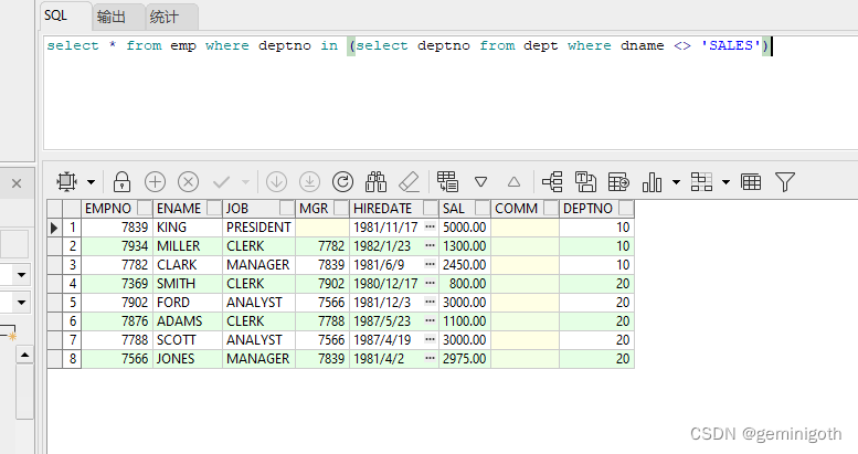 【例3.1.1】在emp表中,查询不是销售部门SALES的员工信息