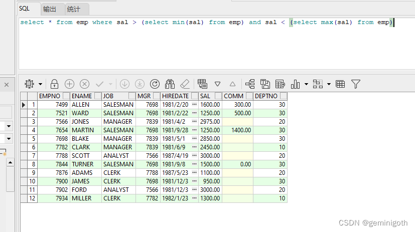【例2.1】在emp表中,查询出既不是最高工资,也不是最低工资的员工信息。